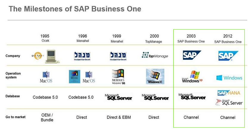 In early 90’s, Shai Agassi and his father, Reuven Agassi, started The QuickSoft Company. At that time, the financial software available for small and midsize businesses was dominated by DOS operating system. The biggest player of financial systems and the distributor of Apple computers in Israel joined forces to develop a financials software system for the Macintosh but they failed. In 1994, QuickSoft and Macintosh distributor join force once againEarlier time, the system called OCEK (Practitioner in English) and this is the reason that most of the Database files in SAP Business One start with O (OINV, OCRD, etc.).